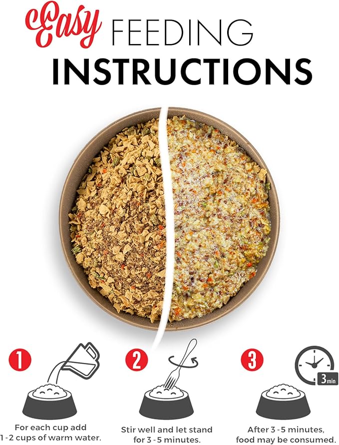 - JUST ADD WATER - For each cup of dog food add 1-2 cups of warm water. Stir well and let stand for 3-5 minutes