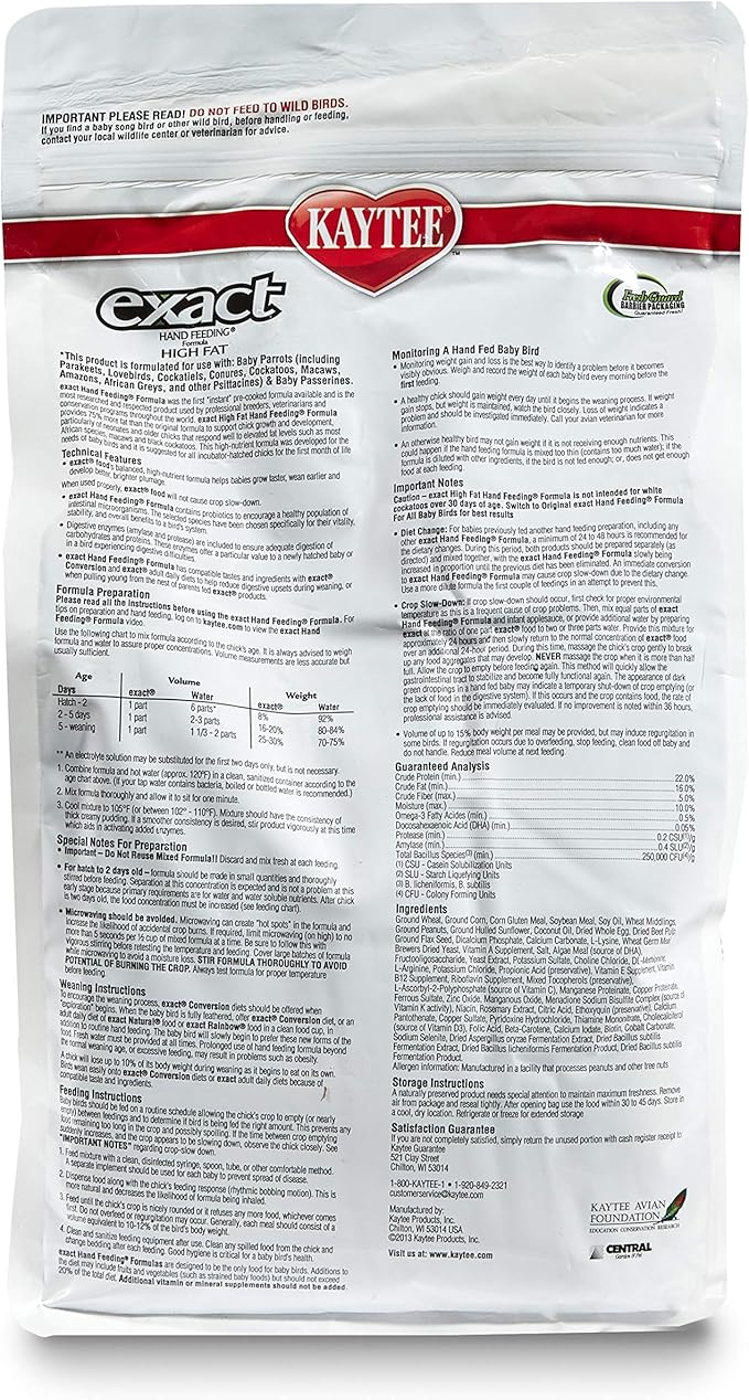 Kaytee Exact Hand Feeding High Fat Formula Pet Bird Baby Food For Parrots, Parakeets, Lovebirds, Cockatiels, Conures, Cockatoos, and Macaws, 5 Pound