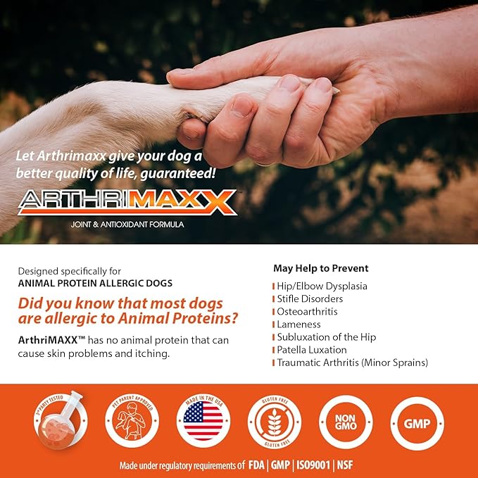 - Powerful Yet Gentle Natural Joint Care: ArthriMAXX soft chews are a natural joint supplement that effectively helps treat dysplasia, inflammation, arthritis, and other joint issues in dogs; Engineered with glucosamine, turmeric, Omega 3, and other potent 100% natural ingredients; No sugar, soy, milk, salt, wheat, or yeast added
