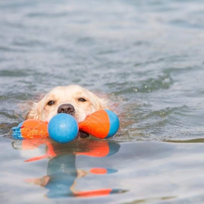 - TUMBLING DESIGN: Featuring bouncy rubber end-caps, this dog bumper toy tumbles end-over-end when thrown for exciting games of fetch