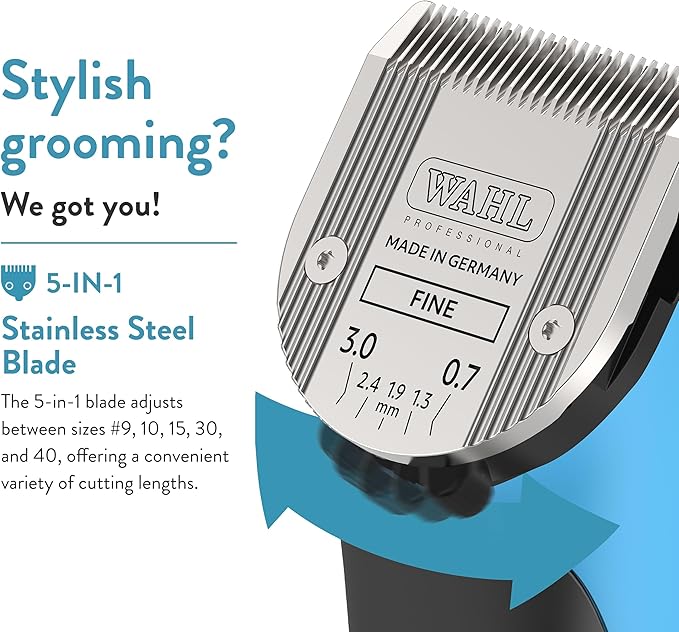 - Pet Grooming Clippers: Features an adjustable 5-in-1 Fine Blade (#9, #10, #15, #30, #40) for precise trimming across all hair types and cutting lengths