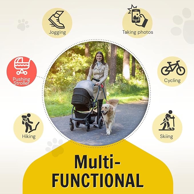 - HANDS FREE COMFORT AND VERSATILITY: Enjoy the flexibility of our hands free leash, where you can freely use your phone, take pictures, eat or drink while walking, running, jogging or hiking with your dog. The adjustable waist belt, ranging from 28" to 49", ensures a comfortable and secure fit, allowing you to take stress off your back, shoulders and wrist
