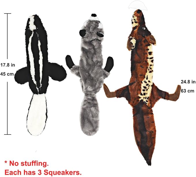 • 3 No stuffing toy (racoon, wolf, skunk) include 3 squeakers each 2 Animal Plush toy: a monkey and a duck goose plush toy
