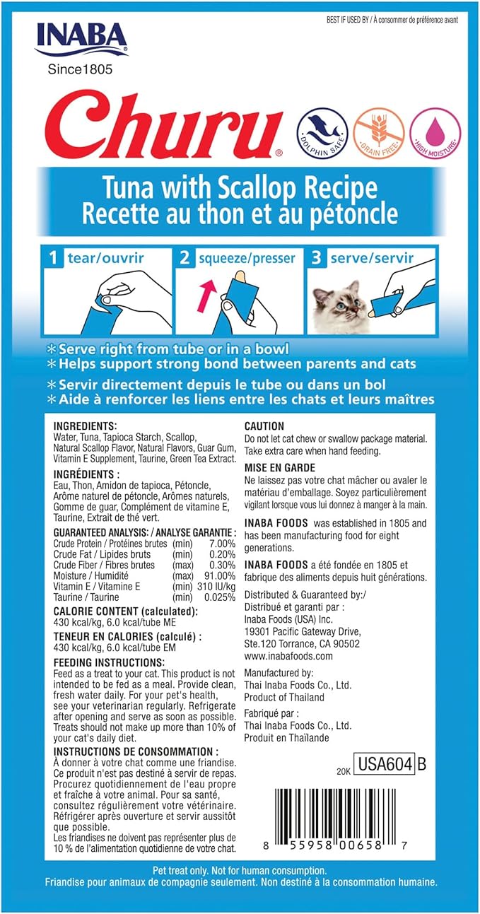 INABA Churu Cat Treats, Grain-Free, Lickable, Squeezable Creamy Purée Cat Treat/Topper with Vitamin E & Taurine, 0.5 Ounces Each Tube, 4 Tubes, Tuna with Scallop Recipe