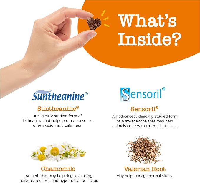 - Featuring Suntheanine - Every chew contains Suntheanine, a clinically studied and super premium form of L-Theanine that helps promote a sense of relaxation and calmness for your pup.
