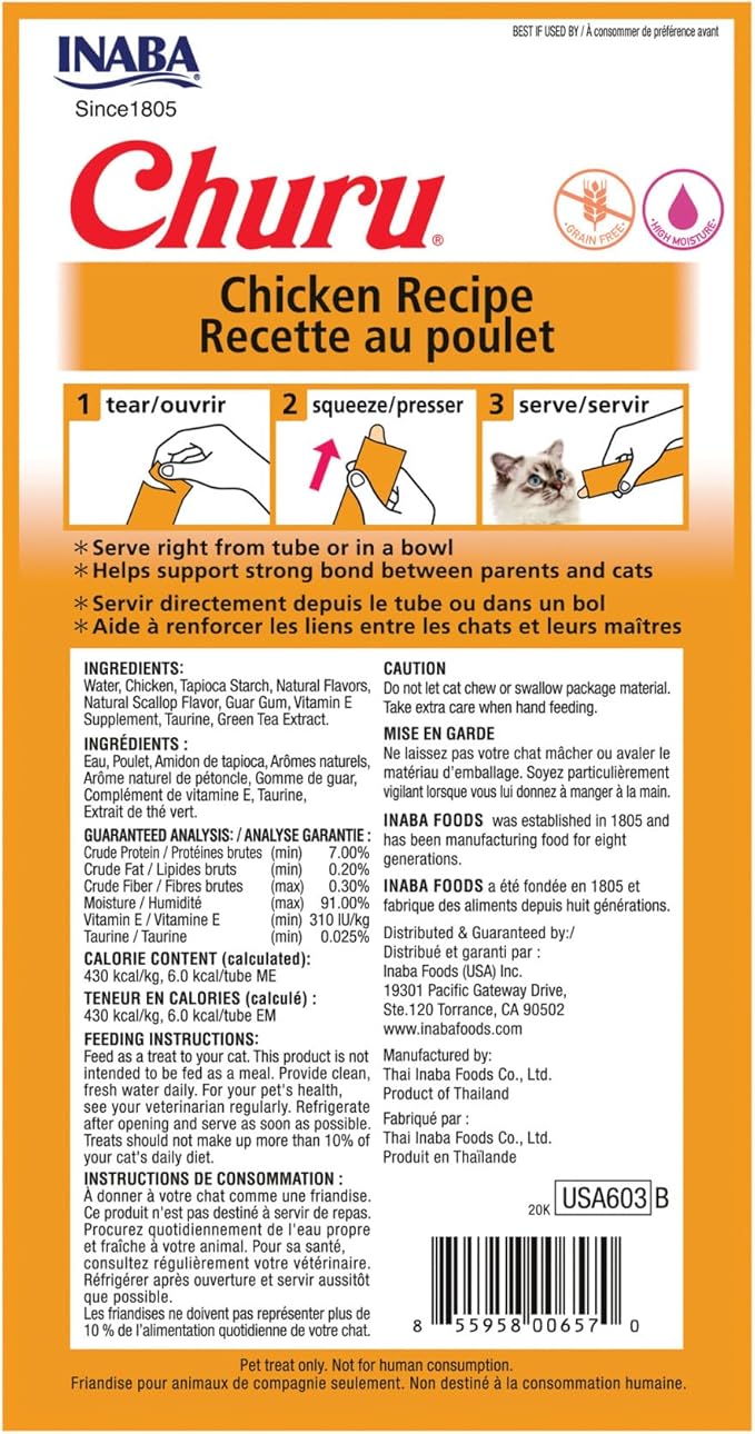 INABA Churu Cat Treats, Grain-Free, Lickable, Squeezable Creamy Purée Cat Treat/Topper with Vitamin E & Taurine, 0.5 Ounces Each Tube, 24 Tubes (4 per Pack), Chicken Recipe