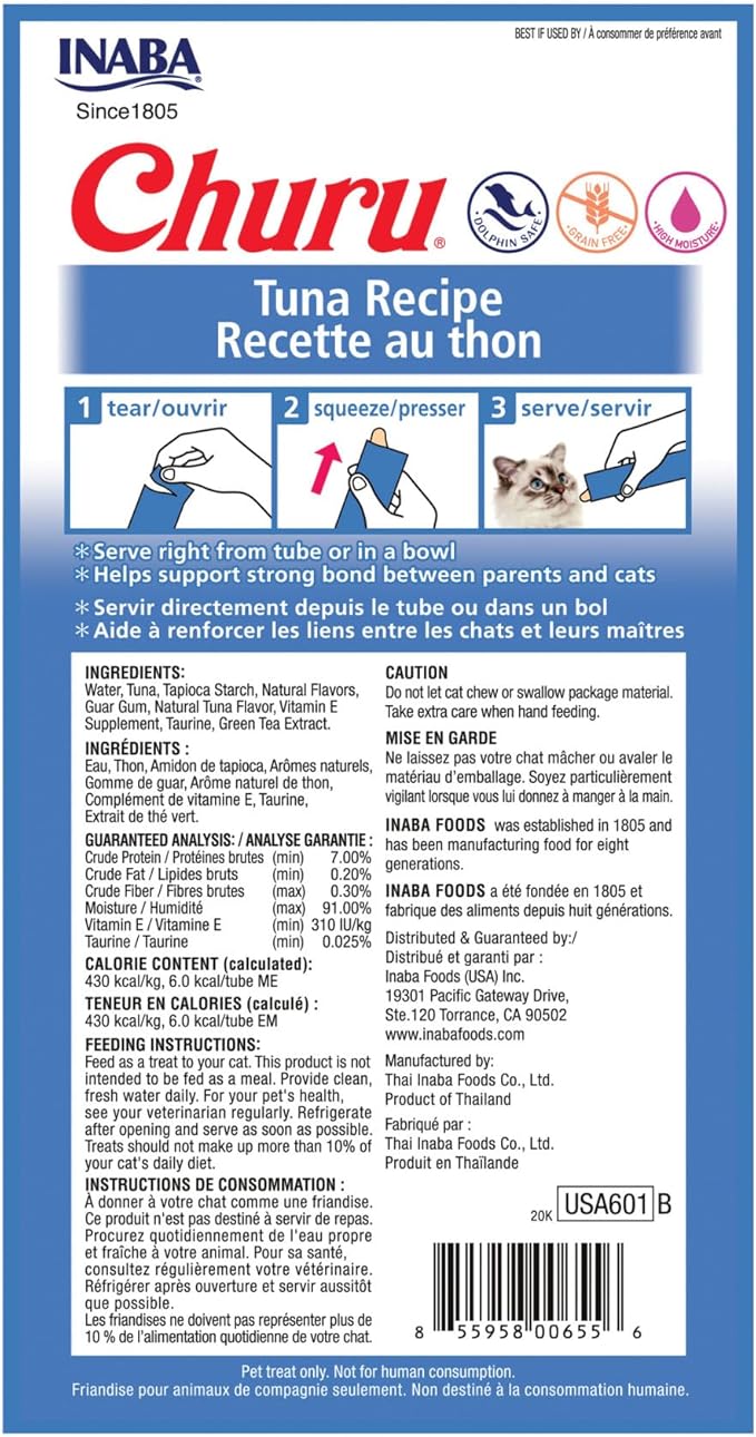 INABA Churu Cat Treats, Grain-Free, Lickable, Squeezable Creamy Purée Cat Treat/Topper with Vitamin E & Taurine, 0.5 Ounces Each Tube, 24 Tubes (4 per Pack), Tuna Recipe