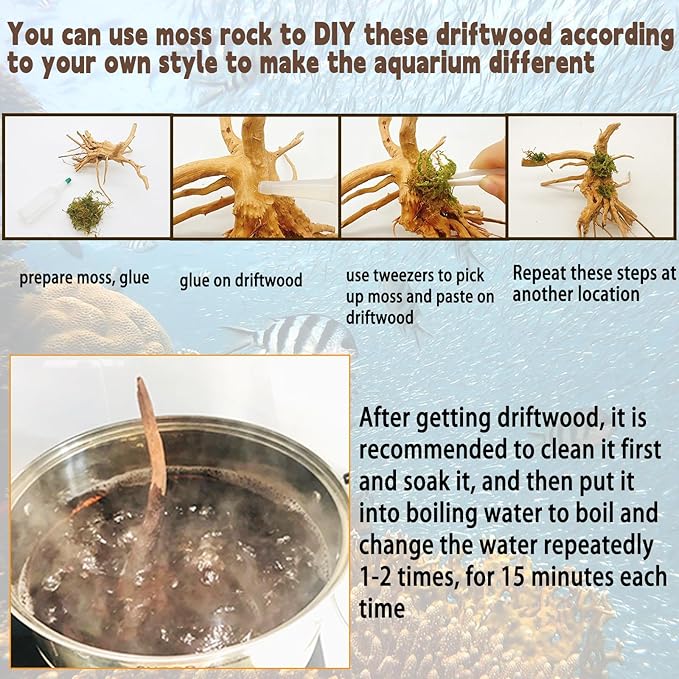 - ✔EASY TO CLEAN --- Unlike live plants, the low maintenance fake decor requires no oxygen or fertilizer.Boiling in water for 1 hours with soda or salt ,the water color will become dark. Boiling the driftwood with water again ( recommended 3 times, 20 minutes each time ) until the tannins totally releases.