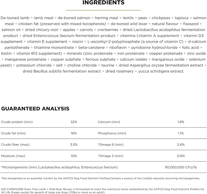 Go! Solutions Carnivore, Grain-Free, Protein Rich Dry Dog Food, Lamb and Wild Boar Recipe, 22 lb Bag