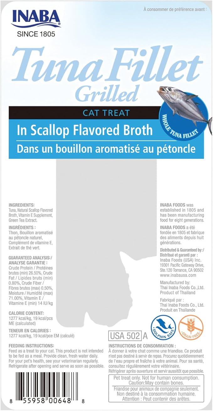 INABA Premium Hand-Cut Grilled Tuna Fillet Cat Treats/Topper with Vitamin E and Green Tea Extract, 0.52 Ounces Each, Pack of 6, Scallop Broth