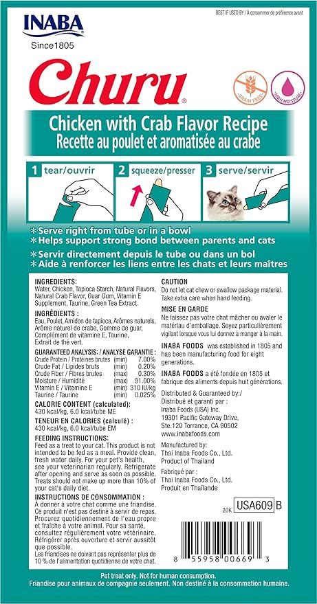 INABA Churu Cat Treats, Grain-Free, Lickable, Squeezable Creamy Purée Cat Treat/Topper with Vitamin E & Taurine, 0.5 Ounces Each Tube, 48 Tubes (4 per Pack), Chicken with Crab Recipe
