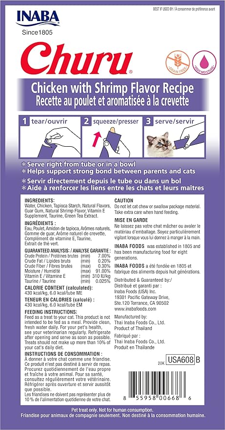 INABA Churu Cat Treats, Grain-Free, Lickable, Squeezable Creamy Purée Cat Treat/Topper with Vitamin E & Taurine, 0.5 Ounces Each Tube, 12 Tubes (4 per Pack), Chicken with Shrimp Recipe