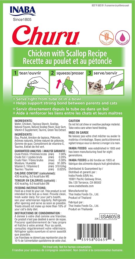 INABA Churu Cat Treats, Grain-Free, Lickable, Squeezable Creamy Purée Cat Treat/Topper with Vitamin E & Taurine, 0.5 Ounces Each Tube, 48 Tubes (4 per Pack), Chicken with Scallop Recipe
