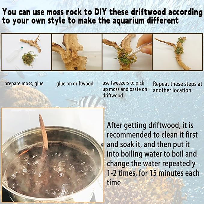 - ✔Note: Natural branch width and length will vary. Each pieces are carefully selected, the pictures shown are only some of theGeneral sizes varies 6-8 inches in length.Please choose according to your fish tank size.Boiling in water for 1 hours with soda or salt ,the water color will become dark. Boiling the driftwood with water again ( recommended 3 times, 20 minutes each time ) until the tannins totally releases.