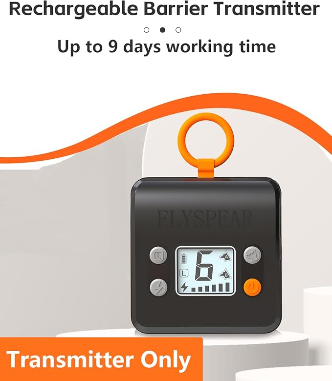 - Rechargeable & Long Battery Life:Unlike other barriers that require constant battery replacements or need to stay plugged in, FLYSPEAR wireless barrier is fully rechargeable. When fully charged, the transmitter can work for about 9 days.