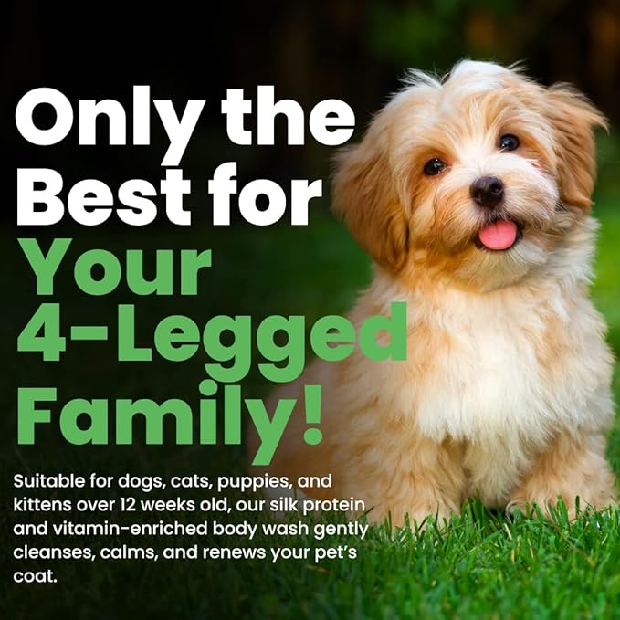 - For Dogs and Cats: Suitable for dogs, cats, puppies, and kittens over 12 weeks old, the body wash is enriched with silk protein, pro-vitamin B5, and vitamin E. Available in a 1-gallon bottle, the pet wash can be diluted up to a 10:1 concentration