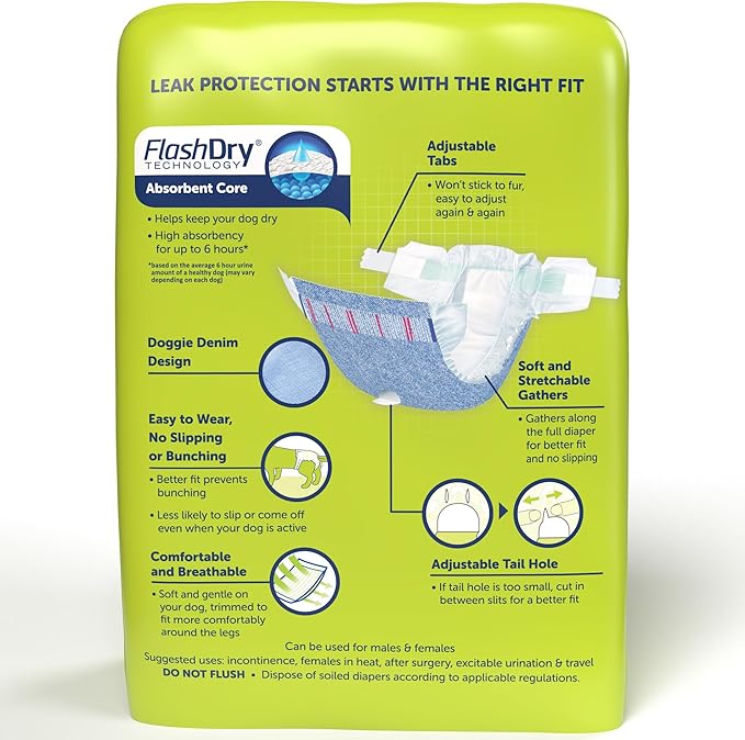 - ADJUSTABLE TAIL HOLE: The adjustable tail hole easily accommodates all tail shapes and sizes..DIAPERS vs. MALE WRAPS: Diapers accommodate both feces and urine. Male wraps are made only for male dogs to be fastened around the waist to absorb urine..M SIZING: 15 – 22" waists, weighing 10 – 26 lbs. Pack of 32 dog diapers.