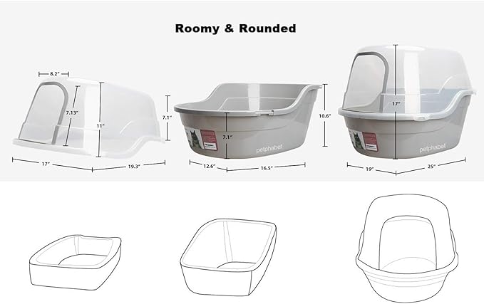 • Roomy & Rounded. Dimension when assembled tall cat litter box is 24.8"L x 20"W x 16.5"H. Door opening size 8.2 X 7.8 inches