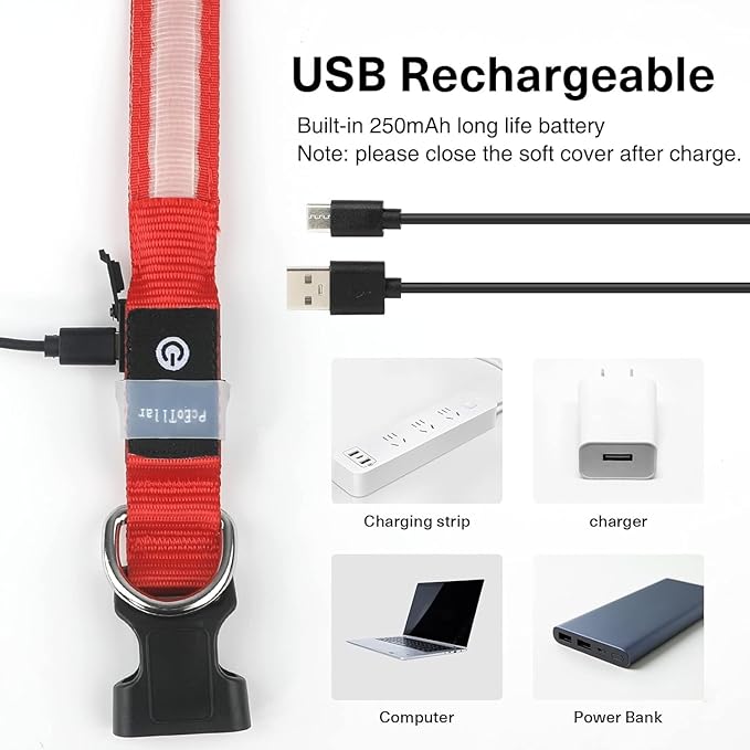 - Rechargeable Led Dog Collar: PcEoTllar dog collar is waterproof. No worries about the collar when your dog is swimming or playing under the water! Please close the Soft Charging Cover after charging and please stay away from sea-water. Rechargeable with any other daily USB device is more convenient, you will not paying for batteries anymore! Full power can last 10 hours.