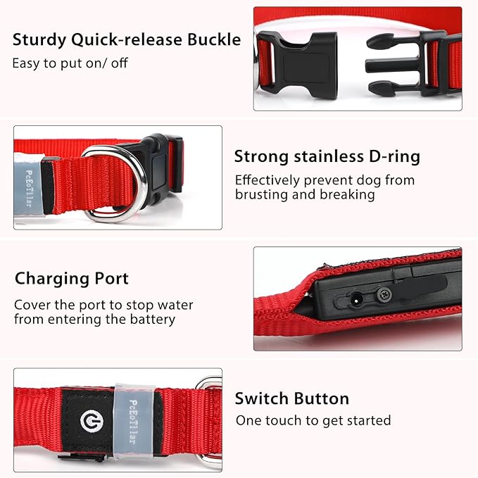 - Durable & Adjustable Lighted Dog Collar: Super strong 100% polyester webbing material with high-tensile stitching for maximum strength & dog security. Easy to put on with a quick-release buckle. And the length of our led dog collar can be adjusted to fit any size. You can even use the led dog collar for animals such as sheep, deer or ponies.
