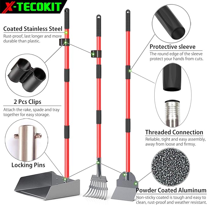 - ❤ Super Value Larger Pooper Scooper Set: Comes with rake, spade and large tray together. Made of powder-coated stainless steel & aluminum, more durable and last longer than plastic pooper scooper. The rake allows for hassle-free pick-up on grass, sand and dirt while the spade is made for flat surfaces like sidewalks, patios, driveways and kennels, and designed with 37.5inch long handles, so you don’t have to bend down. This Dog Waste Scooper Set makes cleaning up after your dog easier than ever
