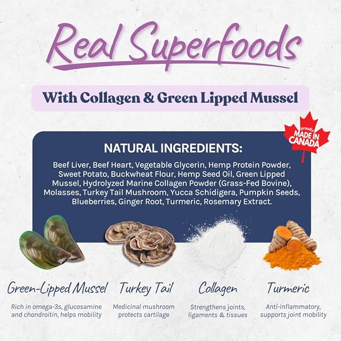 - RICH SOURCE OF BOVINE COLLAGEN - Not only will your dog drool over these healthy beef liver chewables, but they're also getting Canadian-sourced grass-fed bovine collagen with every bite. Over time your dog's collagen production declines and replenishment of collagen in their system can promote dog joint and cartilage health