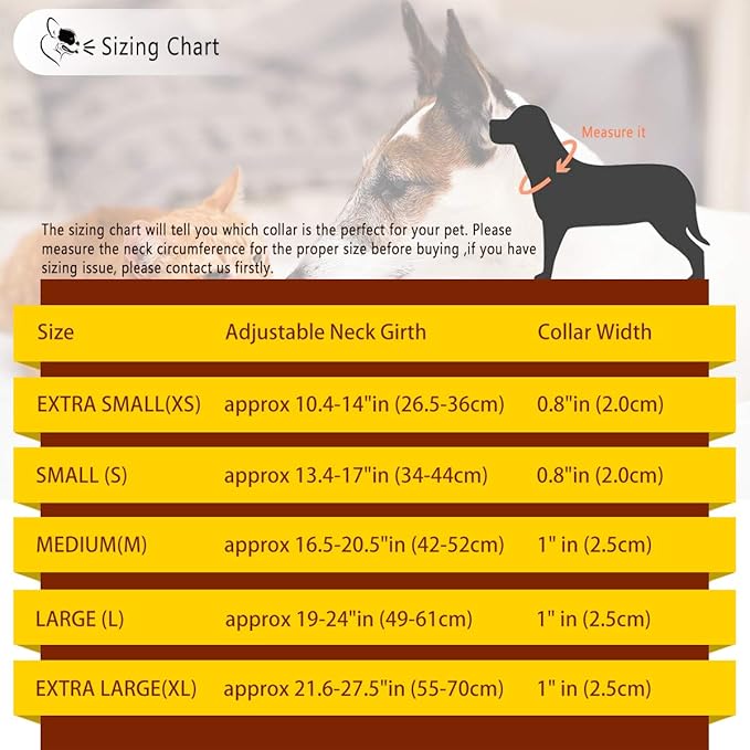 - 🐶Yacig led dog collar available in 5 size:【attention please carefully measure your dog’s neck before adding the collar to your cart.】 【X-Small】-Fits neck size 10.4-14"; 【Small】-Fits neck size 13.4-17"; 【Medium】-Fits neck size 16.5-20.5"; 【Large】-Fits neck size 19-24"; 【X-Large】-Fits neck size 21.6-27.5".