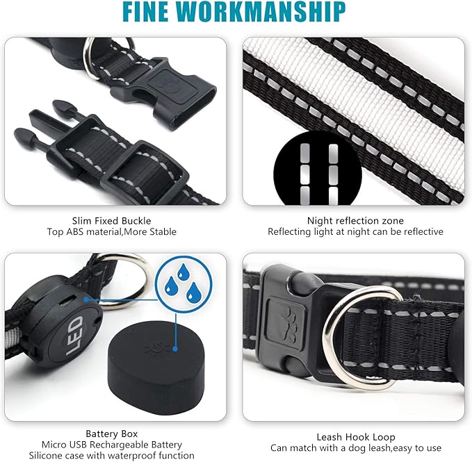 - 🐶Rechargeable & adjustable:Our led light for dog collars can be recharged by Micro USB cable (Charging cable is provided) with daily use devices. no need batteries.each size of the led dog collar can be adjusted with the adjustable strap.You can adjust the size for your dog more easily.