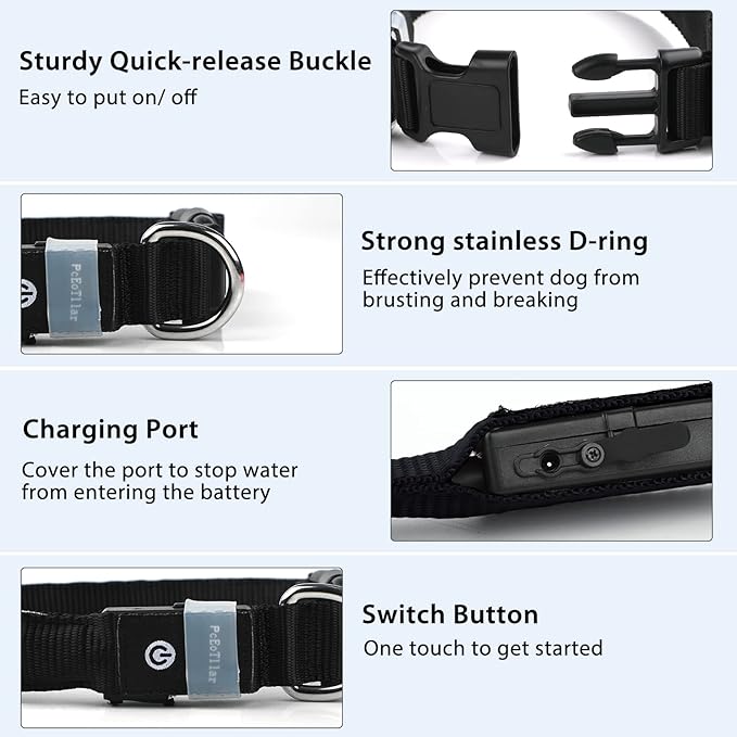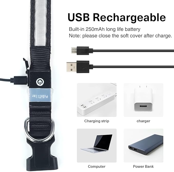 - Rechargeable Led Dog Collar: PcEoTllar dog collar is waterproof. No worries about the collar when your dog is swimming or playing under the water! Please close the Soft Charging Cover after charging and please stay away from sea-water. Rechargeable with any other daily USB device is more convenient, you will not paying for batteries anymore! Full power can last 10 hours.