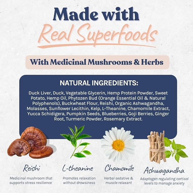 - 🦮 DOG RELAXATION CHEWS: Our dog supplement boasts dog superfoods such as hemp for dogs, reishi, ashwagandha for dogs, yucca for dogs, and turmeric for dogs to help naturally relax our dogs. Our dog calming treats are a comfort dog supplement and will instill dog calm.