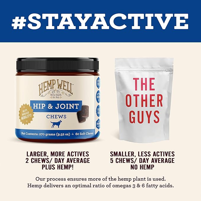 - SUPPORTS HIP AND JOINT HEALTH FOR DOGS recovering from injury or senior pet health. Hemp has natural calming effects and can deliver relaxation to dogs struggling with aching hips and joints. Comes in an easy to administer soft chew form that your pet will enjoy.