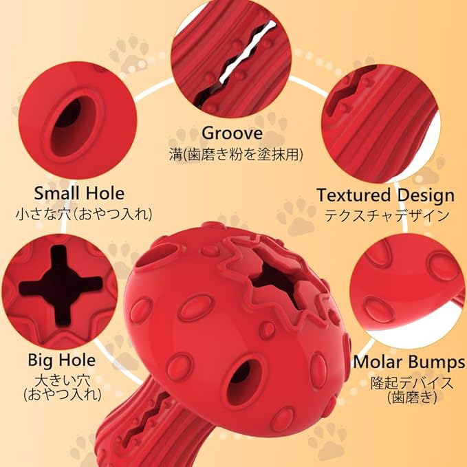 • Teeth Cleaning Toy: There are ridges and bumps on the surface of the mushroom doggy toy and a groove in the stem where you can insert jerky or apply dog toothpaste or peanut butter. It attracts dogs’ interest and helps them clean teeth while teething.