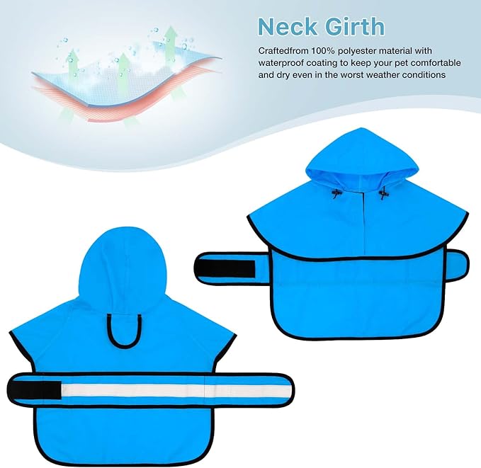 - 【ADJUSTABLE DIMENSION】This dog poncho is adjustable to fit four different sizes—S, M, L, XL. To determine the correct size, measure your dog's neck and chest circumference, and then choose the corresponding size. The neck and belly straps also have adjustable bands to ensure a snug fit.