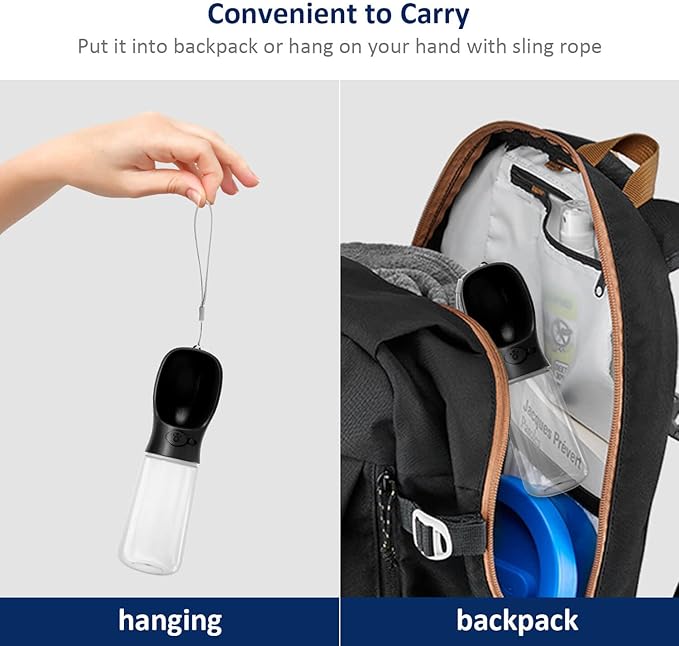 - [Convenient to Carry]: Enough capacity and compact water bottle design is great for your pet dog or cat when outdoor walking, running, hiking, traveling or playing, etc. You can put it into backpack or hang on your hand with sling rope, very easy to carry to anywhere you want.