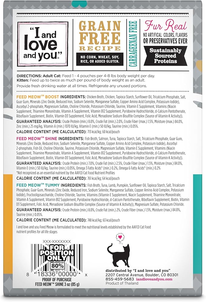 I and love and you Feed Meow Variety Pack - Salmon, Chicken, Tuna - Grain Free, Shredded, No Fillers 3oz Pack of 12