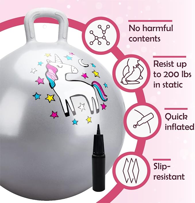 - [ADD MORE MAGIC TO PLAYTIME] INPODAK's silver hopper ball with a funny unicorn design will make playtime even more enchanting. Get ready for endless hours of active play and giggles with this fun and imaginative hopper ball.