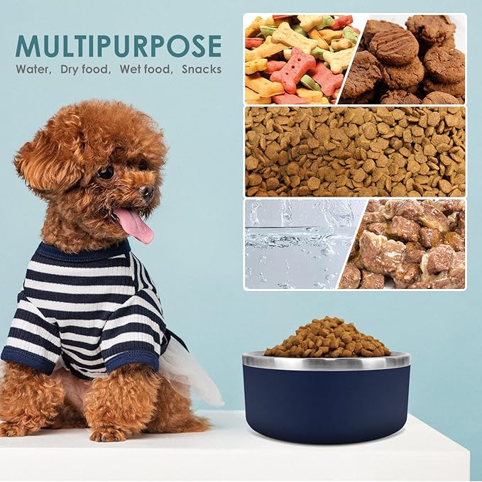 IKITCHEN Dog Bowl for Food and Water, 64 Oz Stainless Steel Pet Feeding Bowl, Durable Non-Skid Double Wall Insulated Heavy Duty with Rubber Bottom for Medium Large Sized Dogs (64 Ounces/8 Cup, Blue)