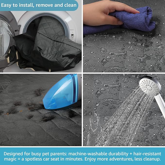 - Easy install, Quickly Remove and Machine Washable: The back seat dog cover for car features a user-friendly installation process that ensures a secure fit for your car interior in moments. Available in multiple colors and designs to match your personal style while providing essential protection. When it's time to clean, wash in machine after muddy adventures or pack up, its seamless removal is just as quick and hassle-free. The ultra-smooth surface and anti-static fabric repel pet hair, while hidden hair-catching grooves trap loose fur. Simply shake off or wipe clean in seconds - no sticky rollers needed! Bye-Bye, Stubborn Pet Hair!