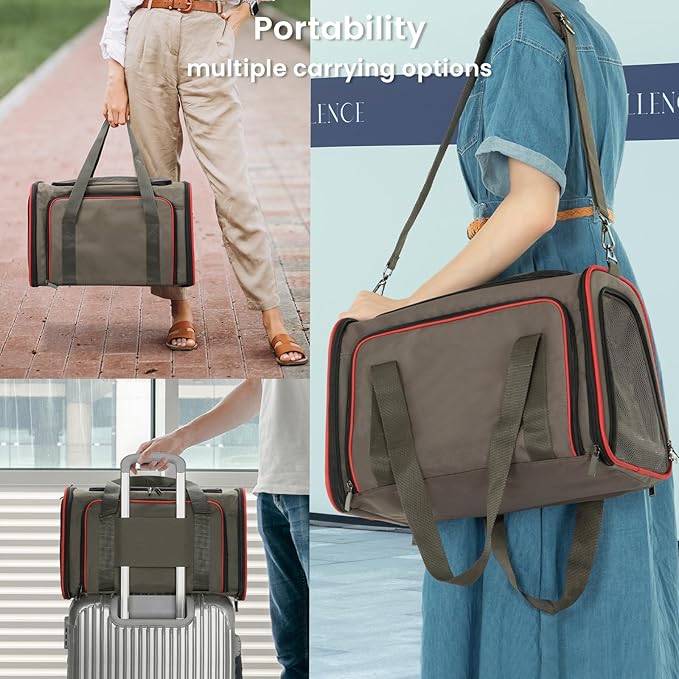 - 【MULTIPLE WAYS TO CARRY 】Self-lock zipper to prevent your pets from escaping. A strap on one side can be slid around the extendable handle of rolling luggage. Two flexible handles to hold with your hands. Additionally, it provides a longer, detachable strap to hang on the shoulders and has a side pocket for storage. 2 handles can velcro together for carrying comfortably.