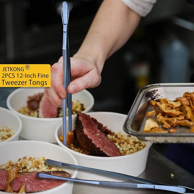 - DURABILITY MATERIAL, EASY ON YOUR HAND - JETKONG kitchen tweezers are made of high quality food grade stainless steel, resistant to rust and corrosion, non-toxic. Dishwasher safe. The thickened kitchen tweezers are very sturdy, tough and durability. while remaining lightweight and easy to handle!