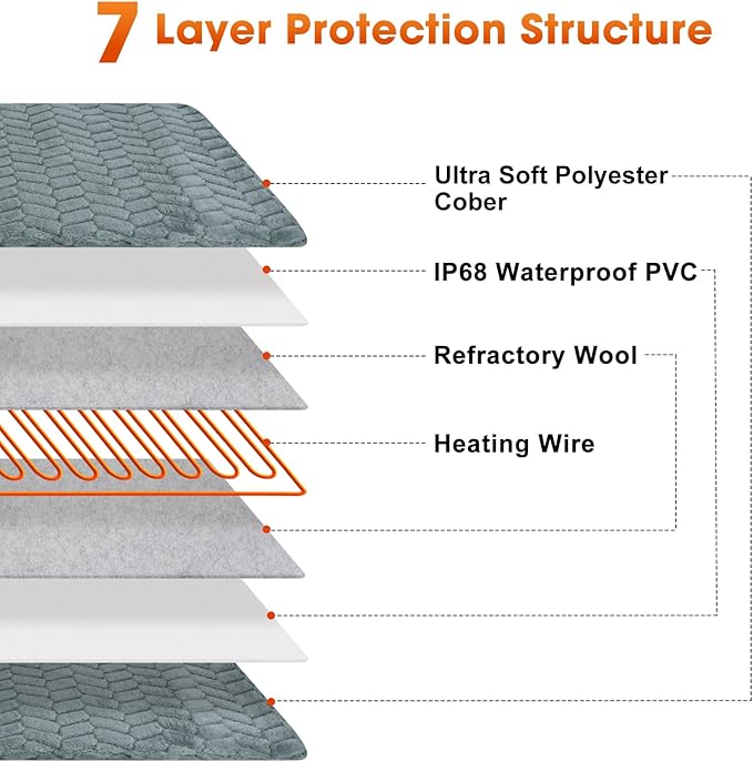 - 🐶【7 layer Protective Structure】The pet heating pad is made of soft velvet cover, waterproof PVC enclose, refractory wool and heating wire. Flame Retardant & Waterproof PVC heating pad has the highest-grade V-0 flame retardant capability with UL-certified heating wire to protect pets from burns. The cord is made from chew resistant steel and can protect your pet from electric shocks if it tends to chew on cables.