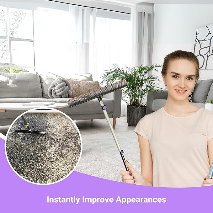 - INSTANTLY IMPROVE APPEARANCES: The Room Groom's long nylon tines reach deep into the fibers of any type of shaggy carpets or rugs and pull the blades upright to provide a maximum bloom. Using short strokes over the area, quickly works any type of infill material in between the blades. This carpet rake can also be used on rtificial turf grass.