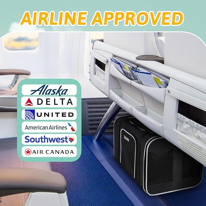 - 【AIRLINE APPROVED CARRIER 】Unfolded size:17"L×11"W×9.5"H, Petskd pet carrier is airline approved and can be placed under the seat in the cabin, it is mainly designed for ①Alaska Airlines:17x11x9.5", but also in compliance with ②Southwest Airlines:18.5x13.5x9.5" ③Delta Airlines:18x11x11" ④United Airlines:18x11x11" ⑤American airlines:18x11x11" ⑥Air Canada:21.5x15.5x10.5". We recommend you buy this carrier when you fly with the above-mentioned airlines.