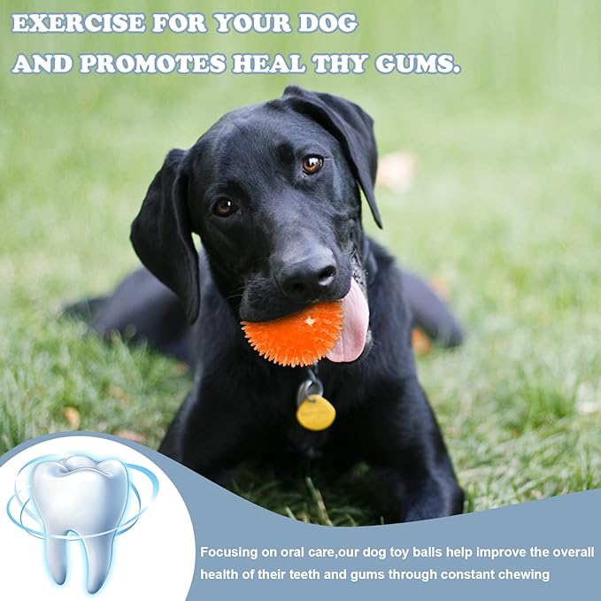 - š¶12 Pack Squeaky Dog Toys: You will get 12 spiky dog balls in red, green, blue and orange colors, 4 of each color. Puppy ball toys 2.5 inches, designed for small and medium-sized breeds, with sufficient quantity and various colors to meet your pet's use needs.