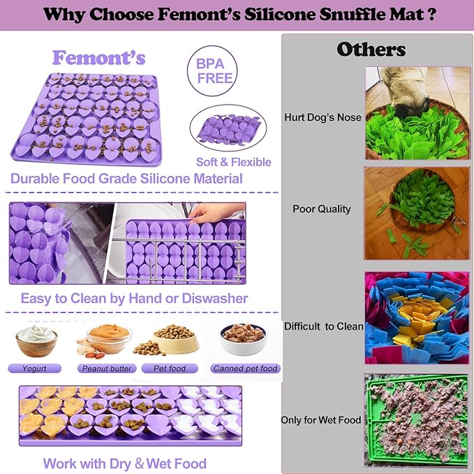 - What Will the Dog Sniffing Mat Bring to Your Pet? The Femont snuffle mat dog effectively reduces the speed of pet’s eating and prolong meal time,promote active and healthy feeding,effectively aid with digestion and bloating caused by eating too fast,also nicely consume their energy,reduces anxiety,relieve stress.Keep dogs occupied then avoid they being bored and engaged in destructive behavior at home.