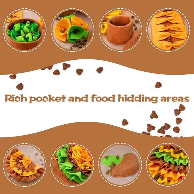- 【Keep Your Dog Busy】The flower shape in the middle of the foraging mat can cover big chunks of food. The dog feeding mat contains various shapes suitable for small size of meals. Simply hide food in the dog puzzles, providing effortless use for encouraging your dog to forage naturally.