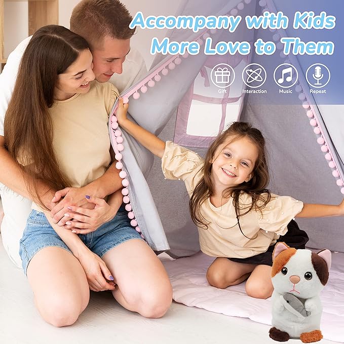 - A INTERESTING TOY FOR KIDS: Still buy some boring stuffed animals or dolls for your little one? Why not try this talking kitty? It can talk back and repeat what you say which helps your kids to learn language in a funny way. This kitty also is a loyal companion. It could accompany your kids all the time and make them happy by clearly repeat whatever they say in its amusing voice.
