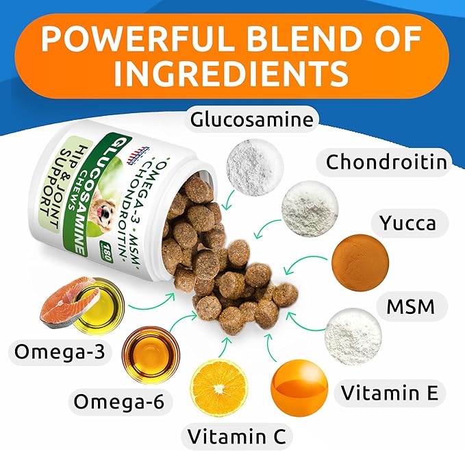 - Vet-Approved Formula: With glucosamine, chondroitin, MSM sulfate & Omega-3-6, our dog hip and joint supplement is the best natural support for your buddy's mobility. Plus, these bites extend the benefits to your pup's flexibility and comfort.