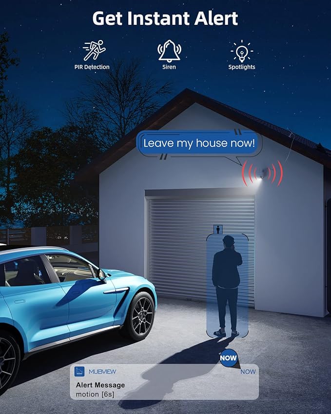 - 【3MP/2K FHD Image & All-Round Security】Experience 360°PTZ (355°pan and 120°tilt) coverage using the 120°wide-angle 2K security camera outdoor. The MUBVIEW outdoor camera wireless offers enhanced color night vision up to 55FT, and features 2 spotlights to brighten the area for clear, detailed images, even in total darkness.