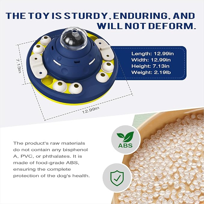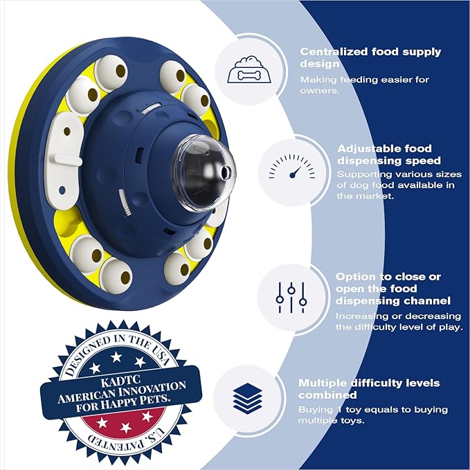 - [Innovative U.S. Design with U.S. Brand and U.S. Patent] KADTC, an American brand, proudly introduces this innovative dog puzzle toy, designed and patented in the USA. Featuring a unique centralized food dispensing design, this toy not only entertains your dog but also promotes slow eating habits, improving digestive health. The toy’s food granary can hold up to 10.05 ounces of food, making it an ideal choice for both mental stimulation and physical activity. Perfect for birthdays, holidays, and special occasions!